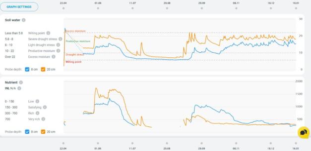 Ffigur 2. Sgrinlun a gymerwyd o ddangosfwrdd synhwyrydd pridd Paul-Tech sy'n dangos data’r tymor cyfan ar gyfer lefelau’r dŵr a oedd ar gael i blanhigion (Dŵr Pridd) a chynnwys maetholion cyffredinol y pridd (Maetholion) ar ddyfnderoedd o 8cm (glas) a 20cm (oren). Ceir bylchau wrth blotio’r graffiau oherwydd i synwyryddion gael eu tynnu ar gyfer aredig (ddiwedd mis Ebrill) ac oherwydd bod cynnwys lleithder y pridd yn rhy isel i gyfrifo lefelau maetholion (mis Awst).