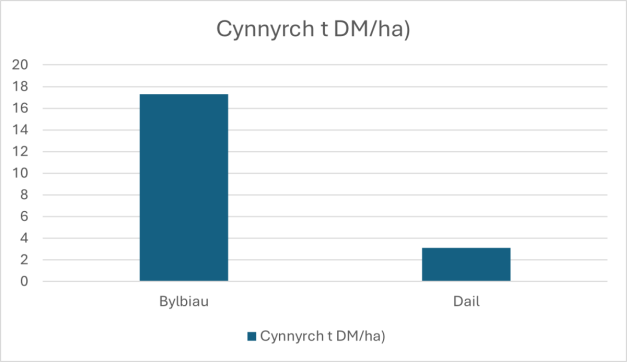 - Cynnyrch DM dail: 3.1 t DM / ha