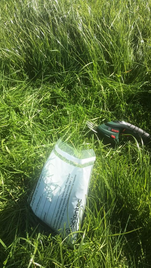 Ffigur 1. Glaswellt ffres yn cael ei dorri a’i anfon i’r labordy i’w ddadansoddi