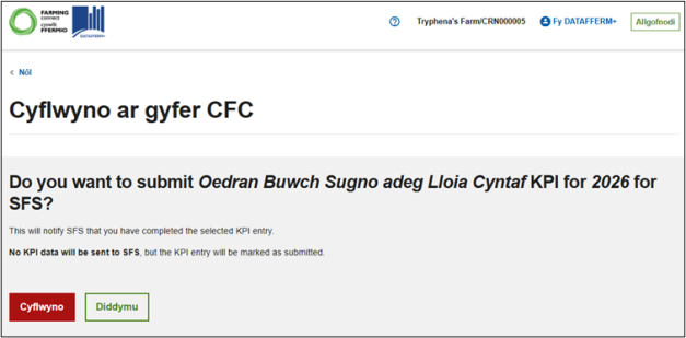 Pa bynnag lwybr a ddewiswch, ar ôl i chi glicio “Cyflwyno ar gyfer yr SFS” gofynnir i chi gadarnhau eich bod yn hapus â’ch dewis:
