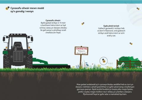 Mewn caeau a oedd yn cael eu defnyddio fel porfeydd neu gaeau i’w torri, roedd stribedi o’r porfeydd aml-rywogaeth yma’n cael eu gadael heb eu torri na’u pori i alluogi’r blodau i ddarparu digonedd o borthiant i’r pryfed peillio. Llwyddodd hyn i hybu niferoedd cacwn yn sylweddol, heb amharu’n ormodol ar gynhyrchiant y cae. Y tro nesaf y byddai’r cae hwnnw’n cael ei dorri neu ei bori, byddai’r stribedi hyn yn cael eu defnyddio a stribed newydd yn cael ei adael er mwyn sicrhau cyflenwad parhaus o flodau i’r gwenyn.