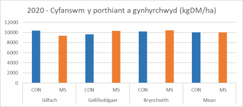 - Dangosodd y prosiect y manteision sydd i’w cael o ail-hadu porfeydd ac fel welwyd cynnyrch parchus ar y ddau fath o wndwn fel y gwelir yn y graff