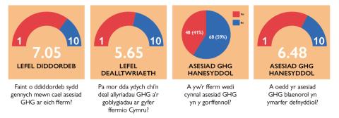 Cymerodd cyfanswm o 116 o ffermwyr ran mewn arolwg cychwynnol i gael dealltwriaeth o’u diddordeb a’u dealltwriaeth o allyriadau nwyon tŷ gwydr. Gellir gweld y canlyniadau isod, gydag 1 yn isel a 10 yn uchel.