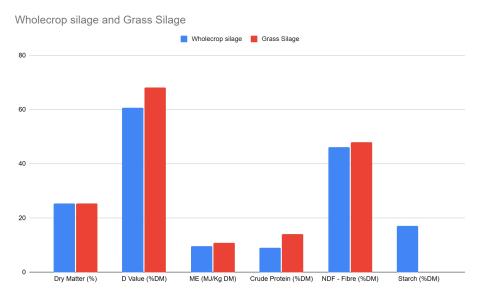 Ar gyfer pesgi gwartheg, fel y gwelir yn ffigur 1, mae’r silwair cnwd cyflawn yn cynnig starts gwerthfawr (17.2%), sy’n hanfodol er mwyn magu pwysau a gorffeniad y carcas, ond mae’n isel mewn protein (9.1% CP). I’r gwrthwyneb, mae’r silwair glaswellt yn cynnig porthiant uchel mewn protein (14.1% CP) ac egni (10.9 ME, 68.1% Gwerth D) o ffibr treuliadwy. Fodd bynnag, mae’n aml yn brin o’r lefelau uchel o starts sy’n angenrheidiol ar gyfer pesgi.