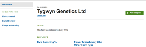 Ar ôl i chi fewngofnodi a dewis enw'r CRN/Fferm yr hoffech ddechrau meincnodi arni, gallwch greu mentrau drwy glicio'r botwm '+ Ychwanegu Menter' ar y Dangosfwrdd.