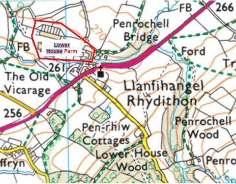 Mae’r map yn Ffigur 1 yn dangos y berthynas rhwng Lower House Farm a’r nant yng Nghoedwig Penrochell.