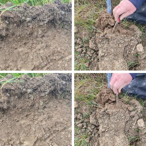 Cafodd priddoedd eu hasesu’n weledol a’u sgorio yn unol â cherdyn sgorio iechyd pridd AHDB a chymerwyd tri sampl graidd o ddyfnder 0-10 a 10-20 cm ym mhob cae i bennu lleithder pridd a dwysedd swmp. Hefyd, gosodwyd tair colofn ymdreiddiad dŵr i gymharu cyfraddau ymdreiddiad dros 15 munud ym mhob maes.