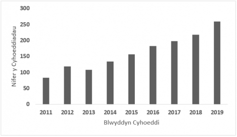 Ffigur 1 Nifer y cyhoeddiadau yn y 10 mlynedd diwethaf o chwilio am “vertical farming” ar y We wyddonol