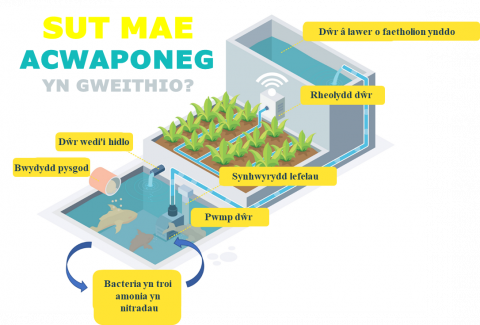 - Mae acwaponeg yn cyfuno strategaethau dyframaethu a hydroponeg