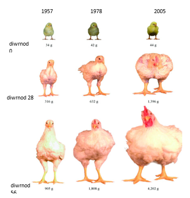 Cymhariaeth rhwng brwyliaid sy’n tyfu’n gyflym o 1957 i 2005 yn dangos newidiadau mewn maint yn seiliedig ar oedran – wedi’i gymryd o Zuidhof et al. 2014