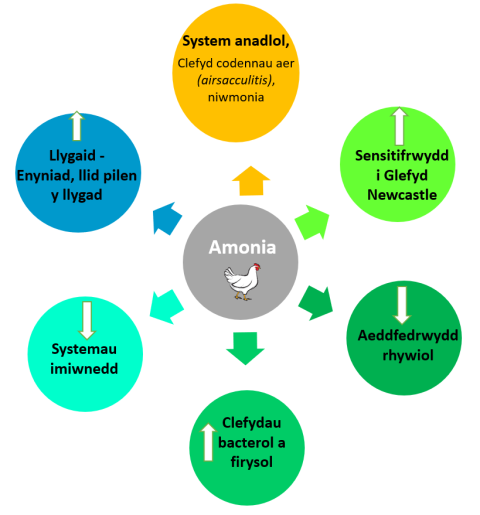 Effeithiau niweidiol allyriadau amonia ar adar – cymerwyd o Swelum et al. 2021