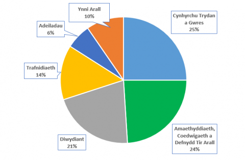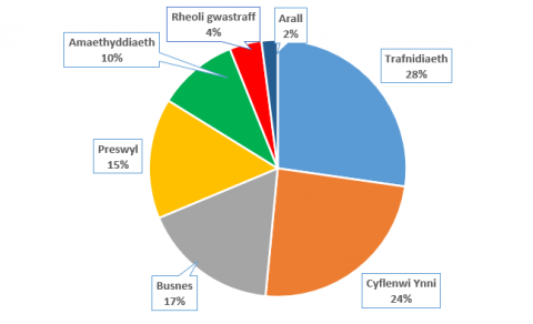 Ffigwr 4 Allyriadau nwyon tŷ gwydr fesul sector yn y DU - Data gan yr Adran Busnes, Ynni a Strategaeth Ddiwydiannol (DBEIS) (2016)