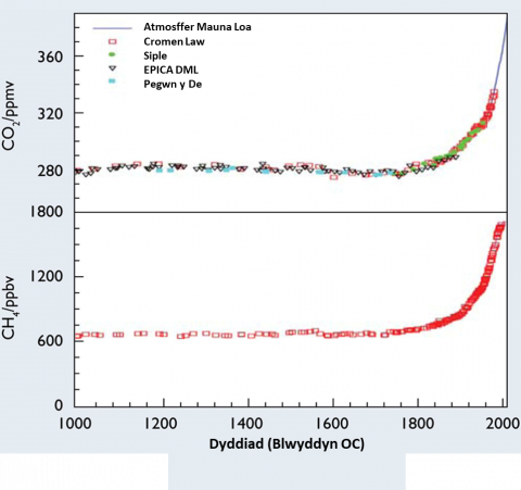 Ffigwr 1 Wedi’i godi o Arolwg Antarctig Prydain – Lefelau CO2 a CH4 dros y 1,000 blynddoedd diwethaf