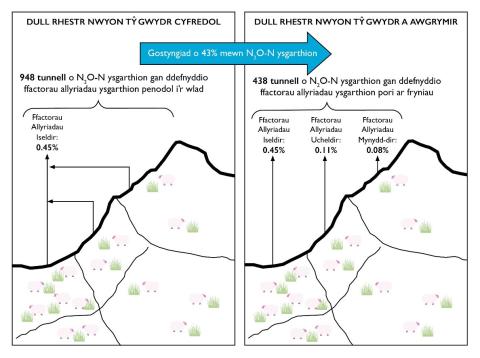 O ran nwyon tŷ gwydr a’r ôl troed carbon yn deillio ohonynt, mae’n debygol y bydd amrywiad rhwng systemau defaid tir isel, ucheldir a’r mynyddoedd gan y bydd y porthiant sydd ar gael, ansawdd y porthiant a maint yr anifail, ei frîd a’i ymddygiad yn gyfnewidiol. Ond, mae diffyg tystiolaeth o ran maint y gwahaniaeth. O ran ocsid nitrus, dangosodd treialon yng Nghymru ostyngiad yn y ffactor allyriant ocsid nitrus o ddarn o wrin wrth symud o’r iseldir i’r ucheldir, a all ostwng yr ocsid nitrus o ffermio defaid ucheldir o 43% (Ffig.1.). Yn 2019 gostyngwyd y ffactor allyriant ar gyfer ocsid nitrus o ddefaid gan y Panel Rhynglywodraethol ar Newid Hinsawdd (IPCC) o wrin defaid o 1% i 0.3%, sydd ag oblygiadau i astudiaethau ôl troed oedd wedi eu cwblhau cyn hynny. Yn ychwanegol, cyfyngedig yw’r ddealltwriaeth o sut y mae methan o eplesu enterig yn amrywio o uchder i uchder er bod gwahaniaeth yn debygol oherwydd y gwahaniaeth yn y rhywogaethau o blanhigion a pha mor dreuliadwy ydynt.