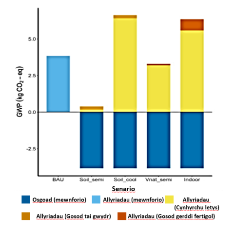 Bu Astudiaeth yn edrych ar sicrhau hunangynhaliaeth mewn llysiau deiliog yn Singapore yn cymharu twf rhwng systemau ffermio fertigol dan do a ffermio fertigol dan do gyda golau naturiol (Vnat), ffermio pridd traddodiadol (BAU) gyda mewnforio, a thai gwydr rhannol gaeedig gyda thwf pridd canolig. Daeth yr astudiaeth i’r casgliad mai twf Vnat oedd fwyaf buddiol ym mhob agwedd heblaw am ddefnydd dŵr, a chafwyd perfformiad ychydig yn well o ran datblygiad pridd mewn tai gwydr o ran cydbwysedd allyriadau CO2e (gweler y ffigwr isod). Mae hyn yn dystiolaeth bellach y byddai cydbwysedd cynaliadwyedd yn gallu symud tuag at systemau CEA os byddai modd lliniaru’r allyriadau sy’n gysylltiedig gyda systemau CEA trwy fesurau effeithlonrwydd ynni, yn yr achos hwn, gyda’r mesurau hyn yn golygu cynnwys golau naturiol o fewn y system Vnat o’i gymharu â’r system dan do.