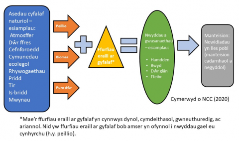 Nodweddion natur y mae’r boblogaeth ddynol yn cael budd neu werth ohonynt yw cyfalaf naturiol. Gall y rhain gynnwys ecosystemau, rhywogaethau, priddoedd, mwynau, dŵr ffres a’r aer. Yn deillio o asedau cyfalaf naturiol penodol darperir nwyddau a gwasanaethau drwy brosesau naturiol ac o ganlyniad i weithrediad ecosystemau. Cyfeirir at y rhain fel gwasanaethau ecosystemau.