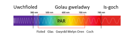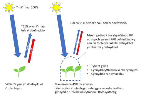 Yn gyntaf, dylem ystyried, o'r golau sy'n mynd i mewn i amgylchedd tŷ gwydr / twnnel polythen, dim ond y rhanbarth sbectrol a elwir yn ymbelydredd gweithredol ffotosynthetig (PAR) a ddefnyddir mewn ffotosynthesis planhigion, ac mae hynny’n cynrychioli 48.7% o gyfanswm ynni’r haul sy'n cyrraedd y ddaear. Mae'n ymddangos bod rhanbarthau eraill o'r sbectrwm megis uwchfioled (UV), isgoch (IR) ac isgoch agos (NIR) yn gwneud cyfraniadau eraill o ran rheoli twf planhigion yn anuniongyrchol. O'r herwydd, ymchwiliwyd i ddefnydd ohonynt trwy drawsnewid ac adlewyrchu tonfeddi gwahanol. Yn achos y rhan fwyaf o blanhigion, mae'r rhanbarthau ffotosynthetig brig rhwng 455 a 760nm ac mae golau glas (455 i 505 nm) yn cyfrannu at dyfiant cynnar cychwynnol planhigion ac mae golau coch (620 - 760 nm) yn bwysicach ar gyfer twf cyffredinol ar ôl cychwyn tyfu.