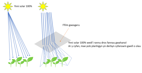 - Trwy ddefnyddio ffilmiau sy'n rhwystro neu'n newid tonfeddi golau penodol, gallwn effeithio ar sut mae cnydau'n tyfu a'r cynnyrch a'r ansawdd a gyflawnir.
