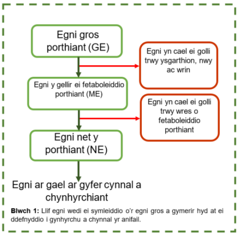 Yn ei hanfod mae effeithlonrwydd porthiant yn nodwedd sy’n dangos pa mor dda y mae’r anifail yn defnyddio egni o borthiant tuag at gynhyrchu. Mae Blwch 1 yn dangos llif egni wedi ei symleiddio yn yr anifail o’r egni gros a gymerir o borthiant i ben draw defnyddio’r egni yma o ran cynnal yr anifail a chynhyrchiant. Mae effeithlonrwydd bwyd yn nodwedd gymhleth ac felly gall fod yn anodd ei mesur. Porthiant gweddilliol a gymerir (RFI) yw’r dull cyffredin o fesur effeithlonrwydd ynni, oherwydd ei fod yn annibynnol ar lefel cynhyrchiant. Diffinnir porthiant gweddilliol a gymerir fel y porthiant gwirioneddol a gymerir mewn cymhariaeth â’r porthiant a ragwelwyd y byddai anifail yn ei gymryd ar sail ei faint - yn ei hanfod pa mor dda y mae egni gros (GE) porthiant yn cael ei drosi yn egni net (NE; gweler Blwch 1). Bydd gan anifail FE uchel RFI isel, ac i’r gwrthwyneb. Dangosodd ymchwil diweddar fod heffrod bîff RFI isel yn cymryd 6% yn llai o borthiant na heffrod RFI uchel. Mae anifeiliaid o’r fath yn debygol o fod â gwell gallu i dreulio; yn syml iawn, maent yn gallu defnyddio mwy o’r egni o’r porthiant yn hytrach na dyrannu mwy i gael ei golli trwy ysgarthion.