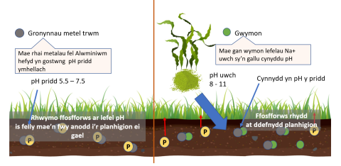 Mae’n hysbys bod gan wymon a chynnyrch gwymon, gan gynnwys biochar, pH niwtral i alcalïaidd a phan fyddant yn cael eu rhoi’n uniongyrchol ar y bridd gallant newid pH y pridd fel cyfrwng calchu. Mae canlyniadau eraill sy’n achosi’r calchu hwn mewn profion yn cynnwys gwymon wedi cael eu cysylltu â lefelau sodiwm (Na+) yn ogystal â lefelau calsiwm (Ca) ac alginad uchel y gwymon, a phan fydd y rhain yn cael eu cyfuno maent yn effeithio ar allu’r gwymon i biogronni metalau trwm. Mae tynnu metalau yn gallu effeithio ar pH trwy atal mynediad at ronynnau mewn priddoedd a fyddai fel arfer yn cynyddu’r asidedd. Gallai rhoi gwymon ar diroedd halogedig sydd wedi’u diraddio fod o gymorth hefyd i dynnu metalau trwm fel alwminiwm (Al) gan rwystro/lleihau gallu Al i rwymo â maetholion sy’n cyfyngu ar blanhigion, fel ffosfforws. Mewn rhai systemau gallai hyn helpu i leihau’r gofynion gwrtaith ymhellach.