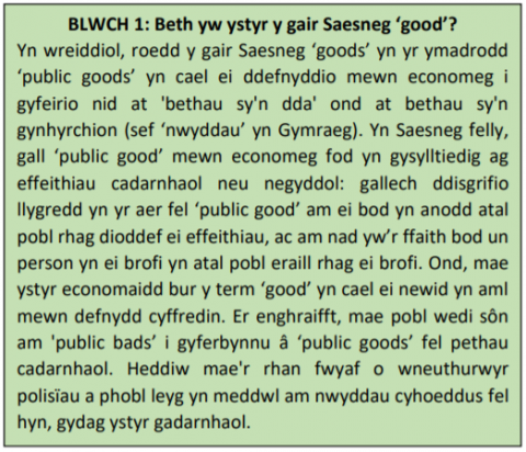 Yn y cyfnod diweddar, mae hyd yn oed ystyr y geiriau yn y term Saesneg 'public goods’ wedi mynd yn ddryslyd (Blwch 1). Mae'r diffiniad hefyd wedi dechrau cael ei ddefnyddio gan wahanol bobl i gyfeirio at wahanol setiau o bethau. Felly mae'r rhaniad rhwng nwyddau cyhoeddus (anghystadleuol, aneithriadwy) a nwyddau preifat (cystadleuol, eithriadwy) yn niwlog.