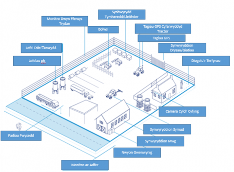 Mae Cyswllt Ffermio ynghyd â lluoedd heddlu Cymru a ffermydd lleol yn ceisio pennu effeithiolrwydd ac ystyriaethau eraill defnyddio IoT ac adnoddau cysylltiedig eraill ar ffermydd. Mewn prosiect ar hyn o bryd gan y Bartneriaeth Arloesedd Ewropeaidd (EIP) mae’r rhwydwaith ardal eang pŵer isel (LPWAN) LoRaWAN yn cael ei threialu ar gyfer cyfathrebu rhwng dyfeisiadau ar gerbydau a giatiau mynediad mewn ymgais i fonitro ac atal troseddau ar ffermydd. Mae LPWAN yn cynnig ystod o gyfathrebu mewn kilometrau, gan ddibynnu ar dopograffeg y pyrth sydd o’i gwmpas, fel y cyfryw gall y rhain osgoi problemau posibl pellter WiFi/Bluetooth a phroblemau o ran signal gyda band eang gwledig a mynediad i’r rhwydwaith symudol. Mae cysylltedd/cyfathrebu hefyd yn bwysig wrth roi adroddiad am unrhyw droseddau neu gysylltu â gwasanaethau argyfwng yn achos damweiniau fel y trafodwyd mewn erthygl flaenorol a gall LPWAN gynnig dewisiadau gwahanol mewn ardaloedd o signal gwael neu ddim signal o gwbl.