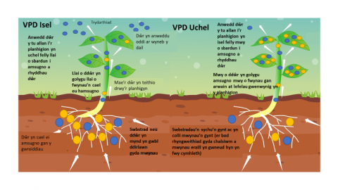 Mae VPD yn ffactor bwysig sy’n dylanwadu ar dwf planhigion, effeithlonrwydd defnyddio dŵr a sefydlogi carbon. O ganlyniad, gall rheoli VPD helpu i sicrhau’r cynhyrchiant gorau posibl o systemau cnydau a choetir, yn ogystal â’u heffeithlonrwydd posibl ar gyfer lliniaru newid hinsawdd trwy storio mwy o garbon. Y ffactorau sy’n dylanwadu fwyaf ar VPD yw tymheredd a lleithder, ac felly mae’n anodd iawn eu rheoli mewn amgylchedd awyr agored. Fodd bynnag, mewn systemau CEA, mae’n bosibl rheoli’r ffactorau hyn hyd at lefelau cywir iawn, gan hwyluso rheolaeth VPD tuag at newidiadau wedi’u targedu o ran twf planhigion. Er bod angen ehangu ar ein dealltwriaeth o VPD ar draws rhywogaethau planhigion, cafwyd tystiolaeth fod rheoli VPD trwy systemau awtomatig sy’n gysylltiedig â synwyryddion cywir yn gallu cael effaith benodol ar gynnyrch, cynnwys maetholion, effeithlonrwydd defnydd dŵr, ac felly ar gynaliadwyedd system gnydau CEA yn gyffredinol. Yn ogystal, gallai ehangu ein dealltwriaeth am VPD ddod yn bwysicach fyth wrth i dueddiadau cynhesu byd eang gynyddu lefelau VPD sy’n bresennol yn yr amgylchedd ar draws y byd gan effeithio ar gynhyrchiant cnydau a’r gallu i sefydlogi carbon.