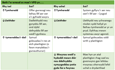 Mae’r gwerthoedd hyn yn ein galluogi i gyfrifo VPD fel a ganlyn;
