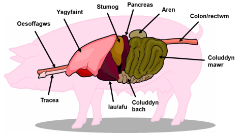 Ffigur 2: Diagram i ddangos anatomi treulio’r mochyn.