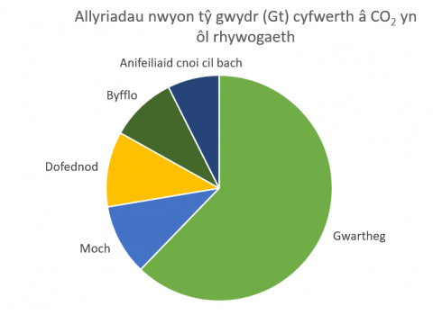 Ffigur 1: Graff yn dangos allyriadau nwyon tŷ gwydr yn ôl gigatunnell cyfwerth â CO2 fesul rhywogaeth da byw ar raddfa fyd-eang (data wedi’i gymryd o’r FAO).