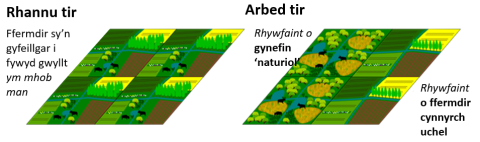 • Mae rhannu tir ac arbed tir yn ddau dull gwahanol o reoli tir er mwyn gwella bioamrywiaeth yn fyd-eang