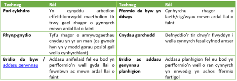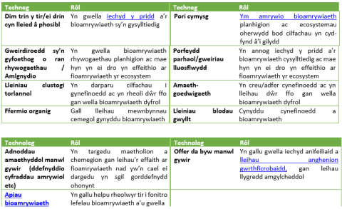 O fewn y ddau gysyniad hwn, mae potensial i ddefnyddio llawer o dechnolegau a thechnegau er mwyn helpu i gyflawni’r nodau. Er mwyn arbed tir, er enghraifft, mae popeth yn dibynnu ar ddwysáu effeithiol fel bod modd cynhyrchu mwy ar lai o dir. Yn yr achosion hyn, gall y technegau canlynol chwarae rôl;