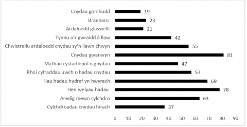 Cyfran ganrannol o brif dechnegau rheoli diwylliannol 384 o ffermydd ar gyfer chwyn mewn glaswelltir (Monsanto UK Ltd)