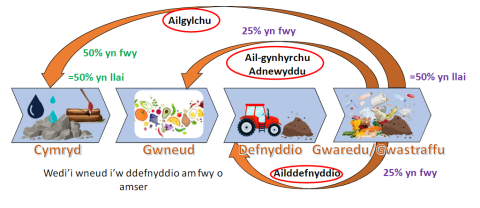 I bob pwrpas, po fwyaf o gylcholdeb a geir rhwng elfennau’r cylch cynhyrchu, y mwyaf o effeithlonrwydd a geir. Mae hyn yn lleihau’r costau cynhyrchu ac yn gwella cynaliadwyedd cynhyrchu yn y tymor hir. Gan feddwl am y diagram uchod yn or-syml, os gall 50% o’ch gofynion maeth rydych yn eu ‘Cymryd’ o’r borfa gael ei gyflenwi o gyfuniad o wastraff a thail da byw, yna bydd costau eich mewnbynnau 50% yn is o wrtaith artiffisial. Mae hyn yn lleihau’r gost o brynu a’r allyriadau nwyon tŷ gwydr sy’n gysylltiedig â chynhyrchu, cludo a defnyddio gwrtaith synthetig.