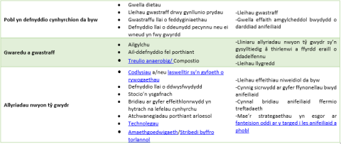 Mae’r technolegau sy’n gallu gwella effeithlonrwydd systemau cylchol da byw yn uniongyrchol neu’n anuniongyrchol yn cynnwys rhai sy’n cael manteision pellach o wastraff. Mae’r rhain yn cynnwys treulio anaerobig ac amrywiol strategaethau compostio ar gyfer gwastraff, sy’n cynhyrchu ynni a gweddillion ar gyfer ailgylchu mwy deuol a rheoli maeth porfa. Caiff y broses hon o ailgylchu gwastraff ac ynni ei thrafod yn fanylach mewn erthyglau i’r dyfodol.