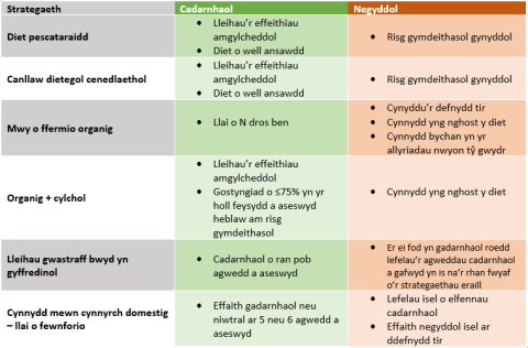 Roedd canfyddiadau’r model hwn yn mapio’n dda â rhai modelau tebyg eraill. Roedd ychwanegu cylcholdeb at system yn gwella bron bob agwedd yn llawer mwy sylweddol nag unrhyw strategaeth arall. Mae hyn yn awgrymu bod gofyn i ddefnyddwyr fynd ati i brynu bwyd a gynhyrchir mewn ffyrdd penodol, neu newid eu hymddygiadau, er mwyn gwella cynaliadwyedd cyflenwadau bwyd. Mae angen i systemau organig cylchol ac organig gael eu dilysu gan y cyhoedd er mwyn lliniaru’r costau cynyddol cysylltiedig. Yr hyn a welwyd hefyd, fel y gellid disgwyl, yw bod y canlyniadau gorau wedi’u cael wrth i ddefnyddwyr gefnogi cyfuniad o’r strategaethau hyn ochr yn ochr â’i gilydd.