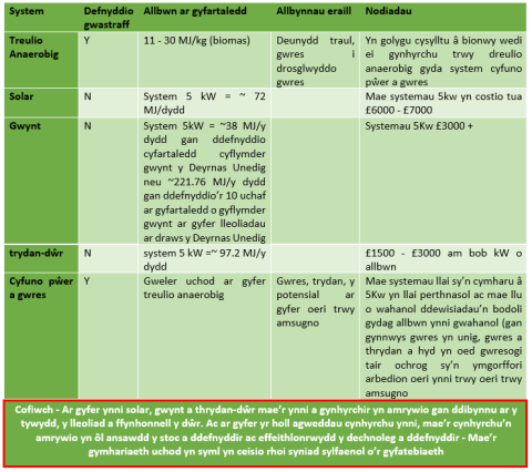 - Gall gwybodaeth am dechnolegau sy’n datblygu a’u gweithredu ar ffermydd, ynghyd ag isadeiledd i roi gwerth ar ynni a gynhyrchir amrywio gan ddibynnu ar y faint y system a’i chymhlethdod