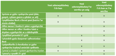 Yn olaf, byddai llawer o ffermwyr a pherchenogion tir yn ceisio rhoi gwerth ar yr ynni maent yn ei gynhyrchu os gallant gynhyrchu mwy na’u gofynion eu hunain. Ond, er mwyn gwerthu ynni yn ôl i’r grid mae angen cael isadeiledd digonol. Nid yn unig mae hyn yn gofyn am osod offer penodol ar gostau ychwanegol, gall hefyd beidio bod yn ddichonol i brosiectau ar raddfa lai mewn rhai lleoliadau daearyddol oherwydd pellter neu’r dull cludo ynni sy’n ofynnol. Yn ei hanfod, newid eu gofynion fel y dangosir yn y tabl isod.
