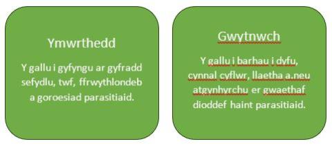 Mae anifeiliaid penodol yn dangos ymwrthedd neu wytnwch i heintiau. Felly, un pwynt ffocws yw bridio dethol i gynhyrchu defaid sy’n dangos ymwrthedd neu wytnwch. Caiff diffiniadau o ymwrthedd a gwytnwch eu hamlinellu isod, fel y’u disgrifir gan SCOPS.
