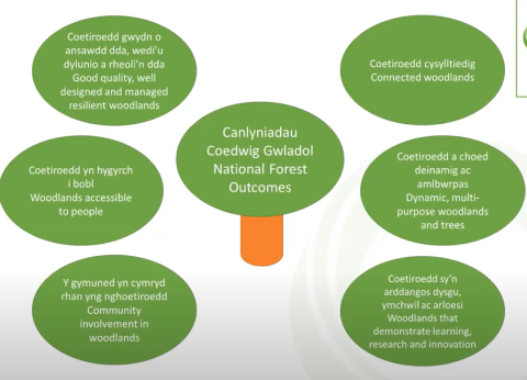 Mae cynrychiolwyr o Lywodraeth Cymru, Erika-Dawson-Davies, Pennaeth y Rhaglen Coedwig Genedlaethol a James Biott, Pennaeth Polisi Coedwig Genedlaethol yn darparu trosolwg o’r rhaglen a statws y rhaglen hyd yn hyn.