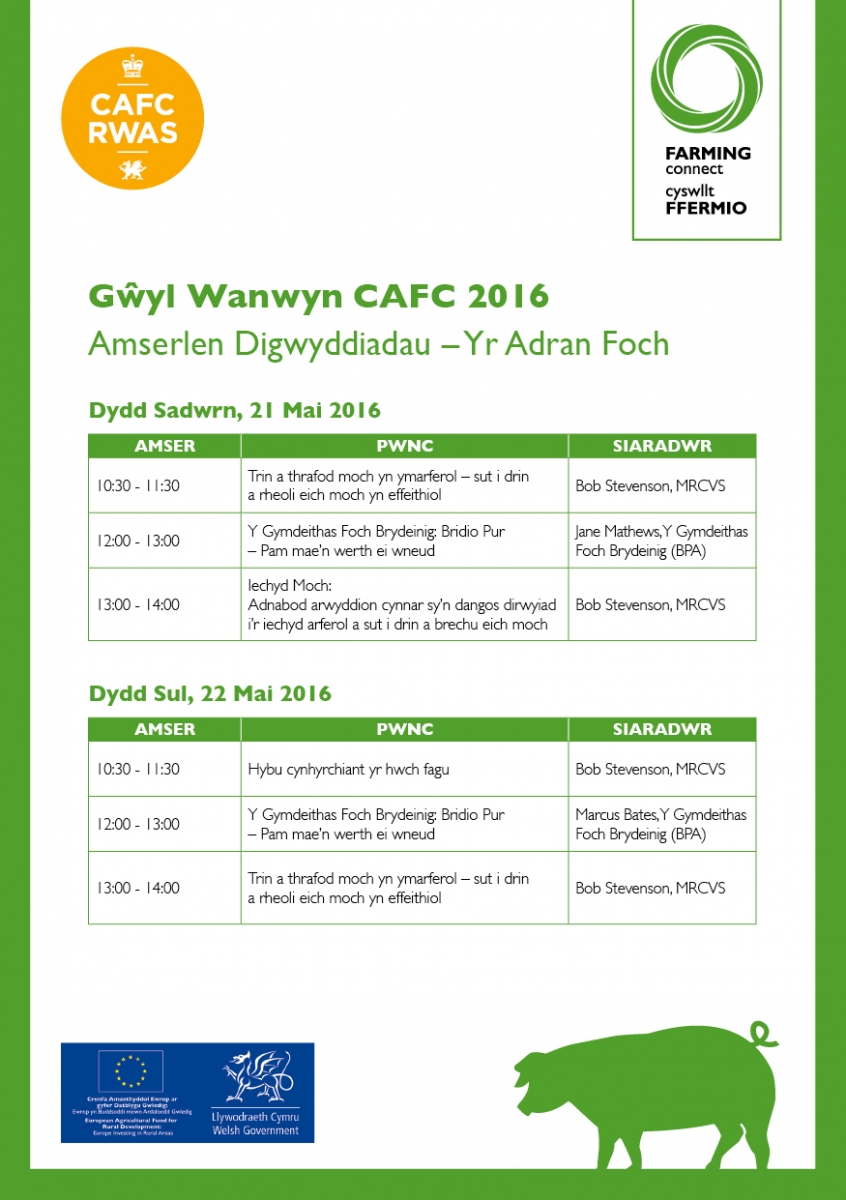 Mae Eirwen Williams, cyfarwyddwr rhaglenni gwledig ym Menter a Busnes, sy’ n darparu gwasanaeth Cyswllt Ffermio, yn disgwyl cyfnod prysur iawn yn ystod y digwyddiad poblogaidd hwn, sydd eleni'n cynnwys cyfres o arddangosiadau ymarferol wedi'u targedu at y rhai sy'n cadw moch, menter ar y cyd rhwng Cyswllt Ffermio a Chymdeithas Amaethyddol Frenhinol Cymru.