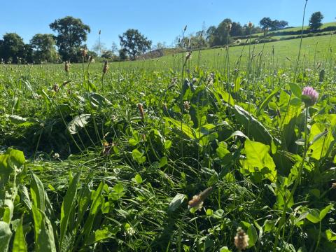 Mae'r fferm yn diogelu'r dyfodol rhag hafau sychach trwy dyfu gwyndynnydd llysieuol; roedd y rhain wedi helpu gyda pherfformiad cig oen ar ôl diddyfnu, meddai Mr Owen.