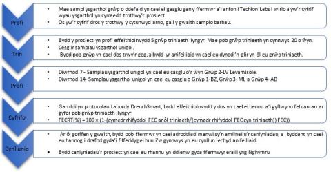 Bydd y gwaith yn cynnwys Prawf Lleihau Cyfrif Wyau Ysgarthol cynhwysfawr ar 5 o wahanol grwpiau o driniaethau llyngyr-