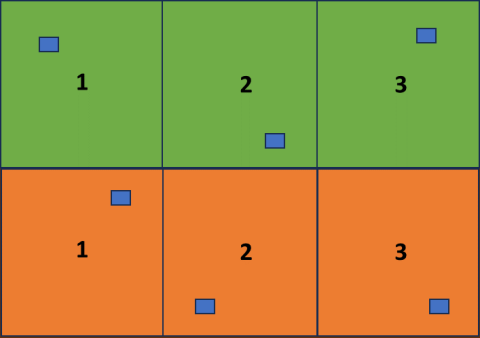 Ffigwr 1. Patrwm cae’r prosiect. Ardaloedd gwyrdd yn dangos y plotiau gwndwn llysieuol a ddyblygwyd(n=3) a’r ardaloedd oren yn dangos y plotiau glaswellt-meillion a ddyblygwyd (n=3). Mae’r ardaloedd glas yn dangos y darnau y bydd anifeiliaid yn cael eu cau ohonynt i gasglu data (bydd union leoliad y rhain yn cael ei drafod gyda’r ffermwyr unigol).