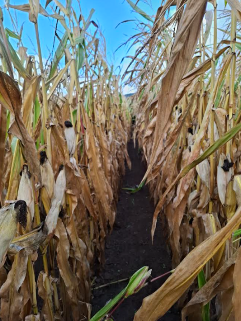 Roedd y gwahaniaeth gweledol wrth gynaeafu’n amlwg yn cefnogi’r data cynnyrch: roedd y llain heb ei thrin yn amlwg yn frown ac yn farw (Ffigur 2), ac roedd y llain a dderbyniodd driniaeth yn dal i fod yn wyrdd (Ffigur 1).