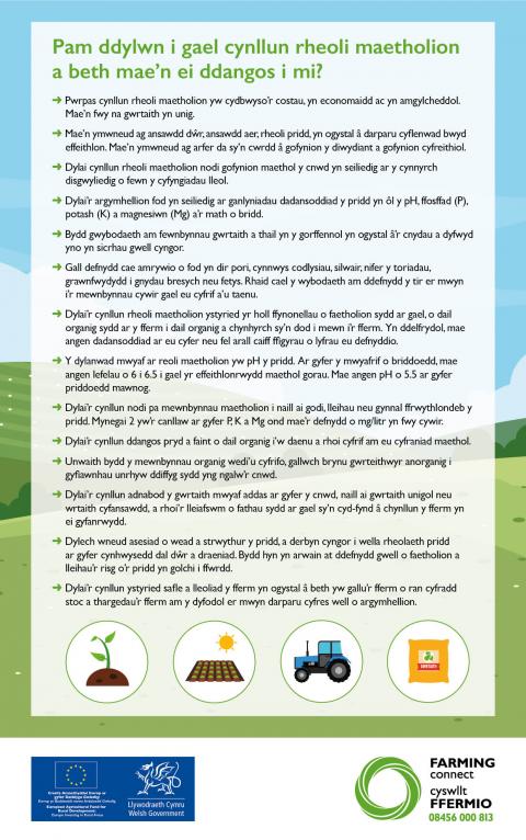 Trwy Wasanaeth Cynghori Cyswllt Ffermio gall ffermwyr gael mynediad at gyllid ar gyfer 70% tuag at Gynllunio Rheoli Maetholion.