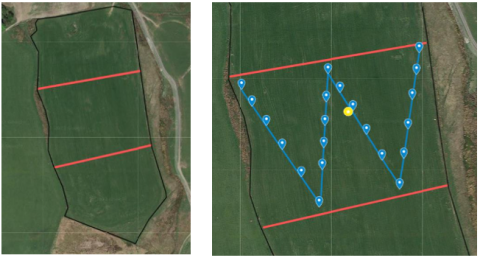Figure 2. Each field split into three zone. Within each zone a soil samples are collected in a W format with the yellow dot representing the location of the bulk density sample.