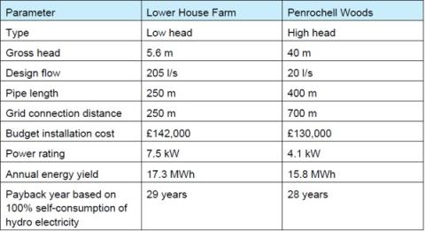 By their nature the two schemes would be very different, a small low flow installation at the high head location and a larger higher flow scheme on the site next to the farm.