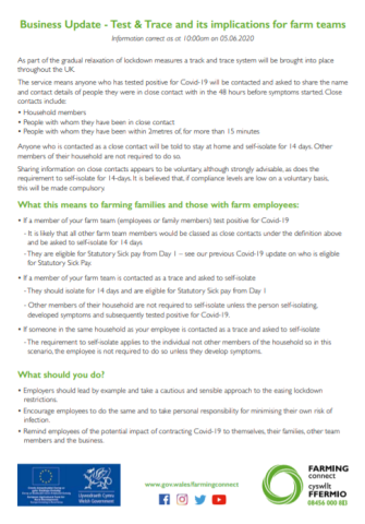Business Update - Test & Trace and its implications for farm teams - 19/06/2020 Type Factsheets Theme Business Business Update - Test & Trace and its implications for farm teams.pdf [.PDF, 218.77 KB] Related News and Events 8 September 2025 Livestock Genetic Improvement To Reduce Ghg Emissions Type: Factsheets Key Sector: Arable, Beef, Dairy, Mixed, Poultry, Sheep Theme: Business, Livestock 4 September 2025 Thinking About Regenerative Farming Type: Factsheets Key Sector: Arable, Beef, Dairy, Mixed, Poultry, Sheep Theme: Business, Land, Livestock Key Specialism: Regenerative Farming 4 September 2025 Plant Passports Type: Factsheets Key Sector: Horticulture Theme: Land More News and Events