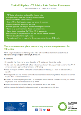 Covid-19 Update - TB Advice & Vet Student Placements - 09/04/2020 Type Factsheets Key Sector Beef, Dairy Theme Business, Livestock CFf_Covid_TBAdvice&VetStudentPlacements.pdf [.PDF, 305.69 KB] Related News and Events 8 September 2025 Livestock Genetic Improvement To Reduce Ghg Emissions Type: Factsheets Key Sector: Arable, Beef, Dairy, Mixed, Poultry, Sheep Theme: Business, Livestock 4 September 2025 Thinking About Regenerative Farming Type: Factsheets Key Sector: Arable, Beef, Dairy, Mixed, Poultry, Sheep Theme: Business, Land, Livestock Key Specialism: Regenerative Farming 4 September 2025 Plant Passports Type: Factsheets Key Sector: Horticulture Theme: Land More News and Events